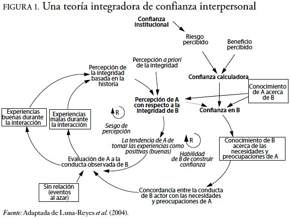 Como se muestra en la figura 1, esta percepción puede estar sesgada por las experiencias pasadas y otros eventos aleatorios. En forma consistente con lo que refiere la literatura, la confianza calculada se considera la relación de beneficio percibido contra riesgo percibido. De igual forma consistente, la confianza institucional trabaja para reducir la percepción de riesgo de la interacción. Finalmente el que otorga la confianza conocerá al que recibe la confianza cuando divulgue la información sobre la relación y como resultado de este conocimiento aprenda acerca de las necesidades y preocupaciones del otro, desarrollando la habilidad de construir su propia integridad de una manera más efectiva.