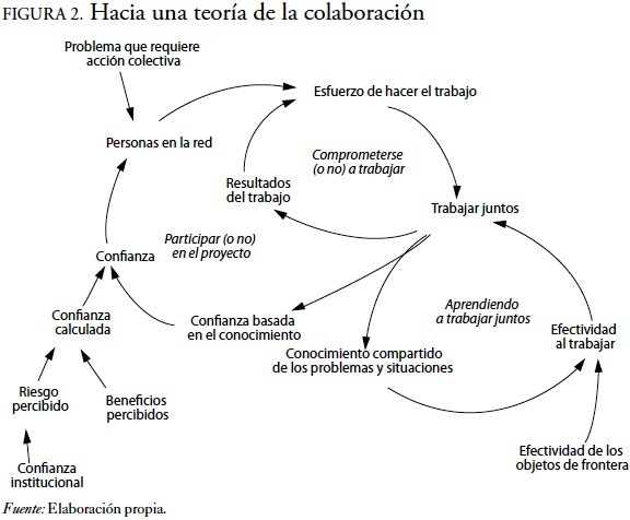 La confianza ha sido reconocida como un factor importante en las relaciones colaborativas y en las redes organizacionales (Ansell y Gash, 2008; Bryson et al., 2006; Milward et al, 2010; Vangen y Huxham, 2003); estos autores destacaron la importancia de la confianza como un "proceso continuo de nutrir" la relación de colaboración a través de un proceso de refuerzo. En su reflexión sobre este proceso, consideraron dos elementos clave para iniciar el ciclo de construcción de la confianza "la habilidad para formar expectativas acerca de los futuros resultados de la colaboración y la voluntad de tomar un riesgo" (Vangen y Huxham, 2003, 16).