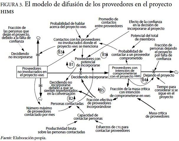 La figura 3 nos muestra una representación conceptual de cómo las organizaciones se incorporan al proyecto HIMS. Los cuadros representan lo que el sistema va acumulando (como el número de proveedores que están dispuestos a comprometerse con el proyecto) y los tubos representan las actividades del sistema (como unirse o dejar el proyecto). Las fuerzas principales a favor de que la gente se una al proyecto son una función de la probabilidad de que hablen acerca del proyecto HIMS y el promedio de contactos con otros proveedores (circuitos de retroalimentación R1 y B1). Este proceso se basa en la existencia de una red previa, representada por el comité de tecnología ad hoc.