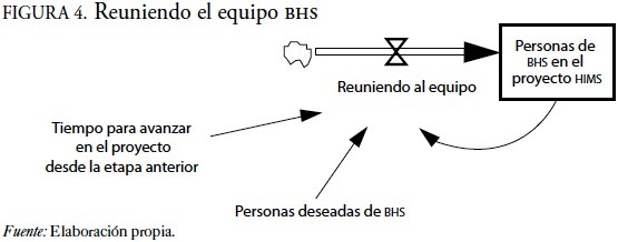 El modelo presentado en este artículo fue conceptualizado inicialmente a través de una serie de tres sesiones de grupos en construcción de modelos de dinámicas de sistema, implicando cinco participantes y observadores del proyecto HIMS (descrito abajo), después de una serie actividades de facilitación para explorar comportamientos en el proyecto, en el tiempo y en relaciones causales, entre las variables clave, con métodos ampliamente aceptados y ya reportados en la literatura para este tipo de sesiones (Andersen y Richardson, 1997; Richardson y Andersen, 1995). Los procedimientos específicos que se siguieron en estas sesiones ya están registrados en la investigación (Luna-Reyes et al., 2006). La conceptualización inicial se desarrolló sobre la base de cuatro entrevistas individuales adicionales y la revisión de la documentación del proyecto.