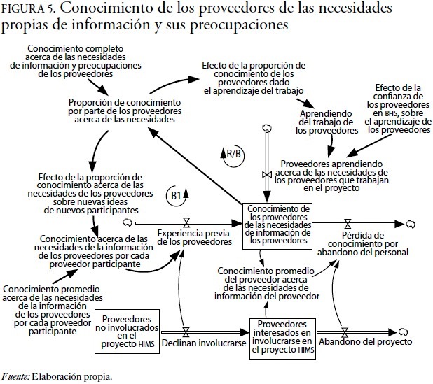Finalmente, el trabajo con los proveedores en el proyecto tiene un propósito específico asociado con el desarrollo del prototipo de HIMS. De esta forma, el esfuerzo de los proveedores fue crítico para completar el trabajo y una vez que se terminó, su nivel de compromiso se redujo para esta fase del trabajo (reflejado en el proceso de balance etiquetado como B en la figura).