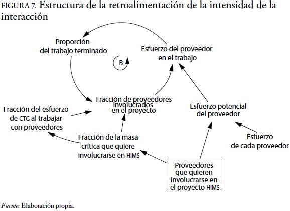 La interacción entre proveedores y BHS proviene del esfuerzo real realizado durante el trabajo para el proyecto. Como se muestra en la figura 7, este esfuerzo es el producto del esfuerzo potencial del proveedor y la fracción de la participación de los proveedores en el proyecto. El esfuerzo potencial de los proveedores es el producto del número de proveedores que quieren comprometerse en el proyecto y el esfuerzo específico que cada uno está dispuesto a invertir. Por otro lado, la fracción de la participación de los proveedores es una función de la fracción de la masa crítica dispuesta a comprometerse y la fracción del esfuerzo de CTG trabajando con ellos. Esto nos indica que el facilitador siempre inició el proceso de colaboración en esta etapa del proyecto.