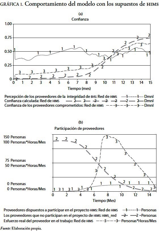 Las gráficas 1a y 1b muestran el comportamiento básico de la confianza y compromiso de los proveedores bajo estas premisas básicas. La gráfica 1a muestra el comportamiento de la confianza y sus dos componentes principales. El componente calculador de la confianza inicia en un nivel bajo, dadas las condiciones iniciales de confianza y conveniencia. Conforme se vaya involucrando en el proyecto el grupo de proveedores, descubrirá los valores reales de riesgo y conveniencia, el componente calculador se incrementa con el tiempo. El componente de confianza basado en conocimiento también inicia en un nivel bajo, dadas la experiencias malas que el grupo de proveedores ha tenido en interacciones de trabajo similares a HIMS. Sin embargo, dado el compromiso de BHS de atender las preocupaciones de los proveedores, la percepción de la confiabilidad de BHS por parte de los proveedores también aumenta con el tiempo a través de la acumulación de experiencias positivas durante la interacción. El comportamiento de la confianza de los proveedores en BHS se parece más al componente calculador en las etapas preliminares del proyecto, dado que los proveedores tienen un conocimiento limitado de BHS en este contexto particular.