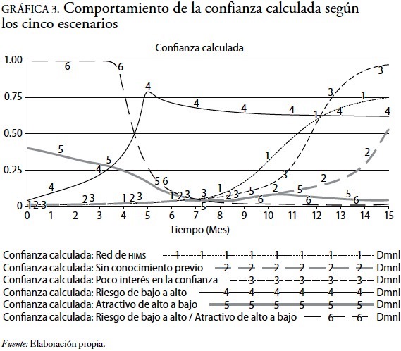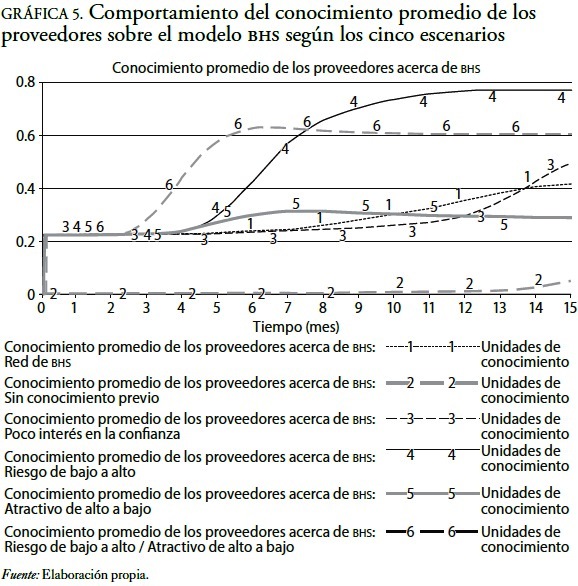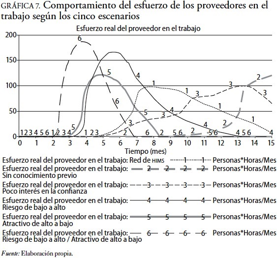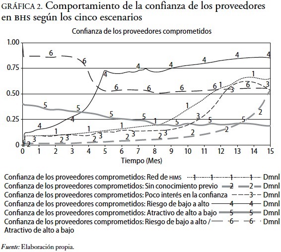 El escenario en el cual tanto el nivel de confianza (gráfica 2) como el número de proveedores que quieren comprometerse (gráfica 6) termina a un nivel más alto es aquel en el que tanto riesgo como conveniencia van de bajo a alto. En este escenario, los componentes calculador (gráfica 3) y el basado en el conocimiento (gráfica 4) de la confianza se incrementan con el tiempo de desarrollo de la simulación. El crecimiento del componente calculador se explica principalmente por los incrementos en la precepción de conveniencia. La confianza calculadora deja de crecer a la velocidad inicial, cuando la percepción de riesgo de usar HIMS en decisiones de financiamiento crece debido al riesgo mínimo de que se divulgue la información. El involucramiento temprano de los proveedores en el proyecto (gráfica 7), promovido por el crecimiento más rápido de la confianza, aumenta el nivel del conocimiento de los proveedores acerca de BHS, lo cual hace que el valor final de la confianza sea más parecido al basado en el conocimiento que el calculador.