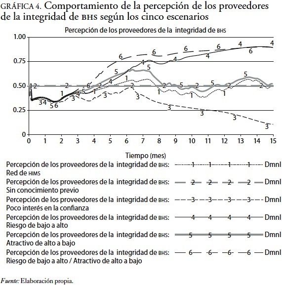El último escenario (poco interés en la confianza) es en cierta medida contrario a la intuición. La percepción de los proveedores de la confiabilidad de BHS (gráfica 4) declina con el tiempo y requiere un esfuerzo adicional del equipo CTG-BHS para incorporar a los proveedores al proyecto. Este esfuerzo adicional provoca una reducción mayor en la percepción del riesgo de divulgación de la información del cliente y aumenta los valores del componente calculador de la confianza, compensando los valores bajos en la percepción de confiabilidad. De esta manera, la confianza crece hasta el mes 13, cuando alcanza un máximo y comienza a declinar. El número de proveedores que quieren incorporarse al proyecto aumenta siguiendo un patrón similar al escenario de HIMS. Sin embargo, los participantes empiezan a dejar el proyecto al final de la simulación, cuando los procesos de refuerzo de confianza y colaboración empiezan a operar en direcciones opuestas. Los resultados de este experimento pueden sugerir que para proyectos pequeños, no hay suficiente tiempo para que el grupo desarrolle una confianza basada en el conocimiento, con base en el componente calculador de la confianza o en otros mecanismos que no están presentes en este modelo.