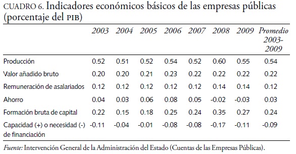 Aún más relevante que el número de entidades instrumentales per se, resulta el dato de su importancia económica (cuadro 6), con el fin de valorar con mayor precisión su importancia en el entramado institucional de las CCAA. Tomando en exclusiva los datos de la producción de las empresas públicas por lo tanto, dejando fuera consorcios, fundaciones y otro tipo de entidades instrumentales se comprueba que su peso económico se ha mantenido muy estable en torno a 0.5 por ciento del PIB, aun cuando su número se ha incrementado notablemente, como ya se comentó. El corolario es inmediato: la productividad media de las empresas públicas ha seguido una senda decreciente entre 2003 y 2009. Las cifras de valor añadido bruto y remuneración de asalariados son también muy estables y ciertamente reducidas. Baste señalar que el gasto en personal ronda 25 por ciento de la producción total de las empresas públicas y es la mitad de los importes de la formación bruta de capital. En cambio, se registran mayores oscilaciones y cierto deterioro en el ahorro generado por las empresas públicas (negativo desde que comenzó la crisis económica en 2008) y en la capacidad de financiación (negativa en todos los años de la serie).