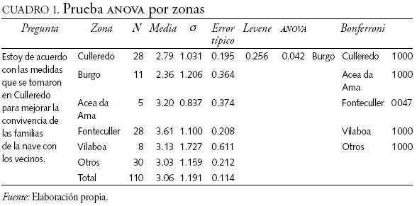 Se reflejan los resultados más significativos. En una de las afirmaciones los participantes debían valorar la política municipal de realojo. El cuadro 1 muestra que la valoración positiva de las políticas es mayor cuanto más próxima es la residencia a las actuales viviendas de los realojados, y que están cerca también de la antigua nave donde se alojaban.7 Además, la mayoría de los encuestados pertenecientes a las familias realojadas señalan estar bastante o totalmente de acuerdo con la actuación del ayuntamiento. Como se señala a lo largo del trabajo, es fundamental el acuerdo de los afectados para realizar con éxito las actuaciones.
