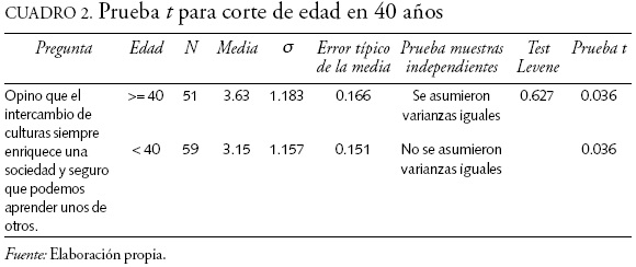 Los encuestados además señalan que la convivencia y la diversidad cultural son enriquecedoras,8 siendo los mayores de 40 años, según la prueba t, los más partidarios de esta afirmación como se puede ver en el cuadro 2. Se constata así la aceptación por parte de la sociedad de una ciudad más heterogénea, con las consecuencias positivas señaladas por Vranken (2001, 7-8). Queda aún la tarea de incidir en los grupos más jóvenes mediante las oportunas campañas de concientización.