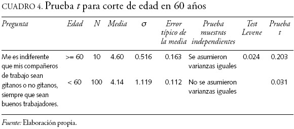 En cuanto a los resultados en inclusión laboral, los encuestados indican que las personas gitanas sufren dificultades especiales para acceder a un puesto de trabajo.13 Dos de los miembros del equipo especializado que el ayuntamiento ha reunido para hacer frente al realojo, comentaron al respecto de este ítem que, si bien es cierto que la situación de crisis y la falta de preparación son barreras importantes de cara al acceso al empleo, existe también una falta de motivación de los miembros del poblado para conseguir un puesto de trabajo normalizado, aspecto en el que han tenido que incidir al mismo tiempo que se aplicaban los programas de formación para el empleo. Por lo tanto se observan en este caso características de las dos corrientes que relacionan el desempleo y la exclusión, y que se mencionaban antes: la falta de motivación de la trampa del desempleo y las barreras estructurales de la teoría de la exclusión social. A pesar de esto, más de la mitad14 de los participantes en el estudio están completamente de acuerdo en compartir lugar de trabajo con un miembro del otro colectivo, siempre que sea buen trabajador. La prueba t muestra diferencias significativas, indicando que el grupo de población de más edad, el que supera los 60 años, es más favorable a esta afirmación (cuadro 4). Este ambiente favorable debe ser aprovechado para aplicar políticas eficaces de inclusión laboral de esta comunidad, que conduzcan a su independencia en el ámbito económico.