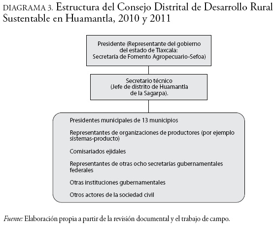 Durante este periodo el CDDRS ya operaba, de hecho se constituyó desde el año 2003. Lo preside un representante del gobierno del estado de Tlaxcala, que en este caso es un funcionario de la Secretaría de Fomento Agropecuario (Sefoa). El cargo de secretario técnico lo ejerce un representante de la Sagarpa, y recae en el jefe de distrito de Huamantla (diagrama 3).