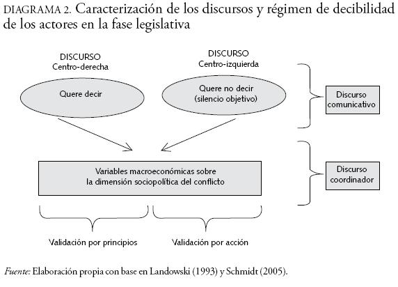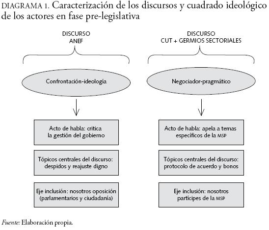 El proceso global de reajuste salarial del sector público en Chile consta de dos fases. La primera es extra-legislativa, en la que asociaciones y gremios negocian con representantes del Ministerio de Hacienda en la mesa del sector público (MSP) con el fin de establecer acuerdos sobre montos, bonos y otras materias laborales; los procedimientos no están escritos y adquieren valor las prácticas estables de los actores que participan. Durante esta fase, los discursos de los actores están prefigurados y son predecibles: los trabajadores solicitan un porcentaje de reajuste y el Ejecutivo ofrece un porcentaje menor, propuestas y contrapropuestas son presentadas a la opinión pública utilizando discursos comunicativos que se articulan sobre la base de argumentos que cobran sentido para cada uno de los actores participantes. Se trata de una "negociación dura" que se mueve sobre la base de las posiciones de los actores y de la lógica del "tira y afloja", centrándose el ejercicio de la negociación en un "regateo entre las partes", que permite lograr eventualmente un "protocolo de acuerdo" de la MSP.