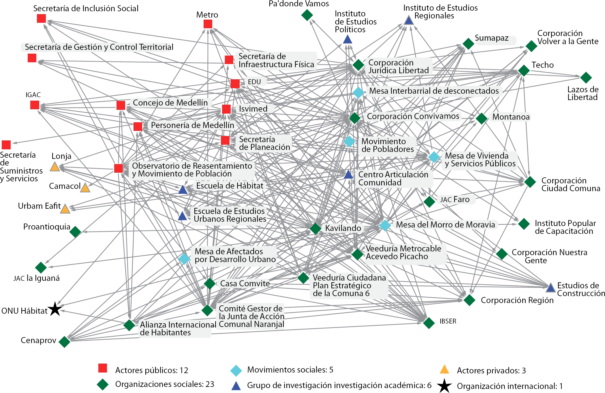 En la gráfica 1, se observan las relaciones recíprocas (en gris) que tienen los actores públicos con los actores sociales: el Isvimed tiene cuatro, el Departamento Administrativo de Planeación, cuatro, el Observatorio de Reasentamiento y Movimiento de Población, tres. Se considera que estas relaciones son significativamente bajas dado que el número total de actores sociales identificados en la red fue de 38. En la gráfica 2, se observa la red con los 50 actores identificados.