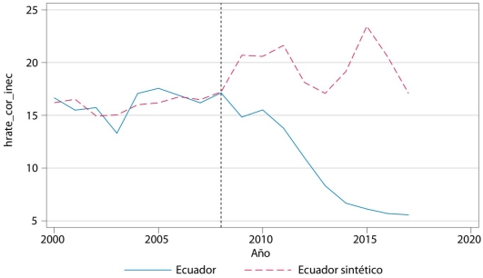 Como se puede observar (gráfica 3), el grupo sintético conformado cumple con el supuesto de identificación al lograr replicar la tendencia de la tasa de homicidios de Ecuador durante el periodo preintervención.