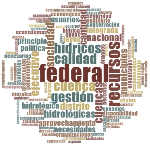 En general, la LAN se centra en el manejo y la regulación del acceso al agua. La nube de palabras (figura 1), acerca del contenido de la ley, no refleja los componentes sociales y ecológicos del funcionamiento del sistema sociohidrológico. Más bien, en primera instancia se observan las escalas de gestión de agua, desde el concepto geográfico de cuenca y la organización político-administrativa, la cual considera la representatividad de la ley a la escala nacional. Lo que se presenta a continuación consiste en un esfuerzo de profundizar en la abstracción del sistema sociohidrológico planteado en la LAN para analizar el grado de integración de conceptos tan comúnmente utilizados en el lenguaje del manejo de recursos naturales.