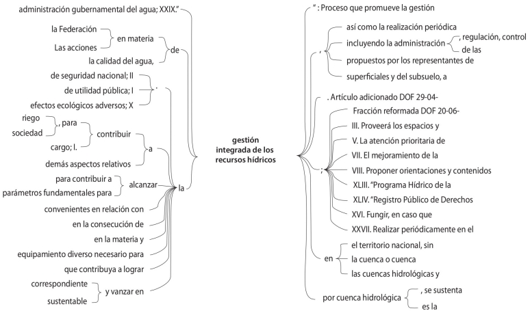 A partir de los fundamentos del SSH, el principal concepto utilizado en la LAN que se refiere a una perspectiva sistémica es el de gestión integrada de los recursos hídricos (GIRH). Dicho concepto se describe en el artículo (art.) 3 de la ley, y se define como: “Proceso que promueve la gestión y desarrollo coordinado del agua, la tierra, los recursos relacionados con estos y el ambiente, con el fin de maximizar el bienestar social y económico equitativamente sin comprometer la sustentabilidad de los ecosistemas vitales. Dicha gestión está íntimamente vincu lada con el desarrollo sustentable”. Para la aplicación de esta ley en relación con este concepto se consideran primordialmente agua y bosque. El concepto aparece en 25 ocasiones, repartido en 16 artículos. El esquema 1 muestra el árbol de palabras para este concepto. Se puede observar un uso generalizado y amplio del concepto, vale la pena destacar que se utiliza como un objetivo a alcanzar mediante la ejecución de la presente ley. Este argumento se sustenta por la anteposición, al concepto principal, de los verbos contribuir, alcanzar, lograr y avanzar.
