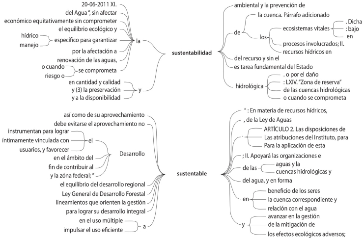 En cuanto a la perspectiva comprensiva sobre sustentabilidad del agua, la LAN cuenta con una definición para el desarrollo sustentable: “Proceso evaluable mediante criterios e indicadores de carácter hídrico, económico, social y ambiental, que tiende a mejorar la calidad de vida y la productividad de las personas, que se fundamenta en las medidas necesarias para la preservación del equilibrio hidrológico, el aprovechamiento y la protección de los recursos hídricos, de manera que no se comprometa la satisfacción de las necesidades de agua de las generaciones futuras”. Además, se utilizaron las palabras clave sustentable y sustentabilidad para ampliar el contexto de uso del concepto. Este fue encontrado en nueve artículos de la ley y en el apartado de transitorios. El esquema 2 muestra los árboles de palabras para ambos conceptos. En este caso, ambos conceptos se presentan como un objetivo, pero también forman parte de las características del manejo de recursos. De esta forma se especifica la búsqueda de una continuidad integral de los valores económicos, ambientales y sociales asociados al agua y las cuencas.