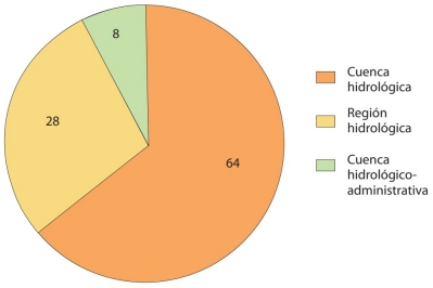 En nuestro caso identificamos un concepto central, el de cuenca. Este aparece en la ley un total de 316 ocasiones en 64 artículos. Sin embargo, otros conceptos identificados como unidades de delimitación derivados de la noción central de cuenca son: cuenca hidrológica, región hidrológica y región hidrológico-administrativa. En el anexo 3 se enlistan las frecuencias correspondientes y la ubicación de las palabras clave en el contenido de la LAN. Por su parte, en la gráfica 1 ejemplificamos la proporción de uso de cada una de estas PC.