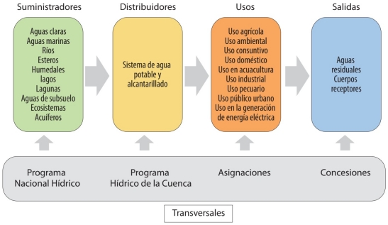 Por sí misma, la LAN no reconoce a los ecosistemas suministradores del agua como un recurso o un servicio. Sin embargo, como lo muestra el diagrama 2, en la ley se describen algunos ecosistemas relacionados con el agua como ríos, esteros, humedales, lagos y lagunas. En lo referente a los distribuidores, el sistema de agua potable y alcantarillado fue considerado como el único concepto relacionado con esta categoría. Este sistema solo se menciona en una ocasión dentro de la ley, por lo que su funcionamiento y sus interacciones con los suministradores y usos no se describe suficientemente. No obstante, sí se reconocen los actores involucrados en su supervisión, tales como los gobiernos estatales y municipales. En cuanto a los usos, la LAN cuenta con un título dedicado a los tipos de uso que la mencionada ley regula. De manera cuantitativa, es el uso doméstico el que está mejor representado en la LAN (35%). Este se define en el artículo 3° como el referente al aprovechamiento del agua en “hogar, riego de sus jardines y de árboles de ornato, incluyendo el abrevadero de animales domésticos que no constituya una actividad lucrativa […]”.