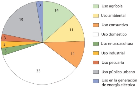 Sin embargo, tal y como lo muestra la gráfica 3, dentro de los dominios de actividad asociados a los usos, el doméstico (35%) es el que refleja mayor frecuencia en la LAN, seguido del uso público urbano (19%) y el uso agrícola (14%). En caso contrario los usos industrial, pecuario y en acuacultura están presentes en menor proporción, con 3 por ciento cada uno.