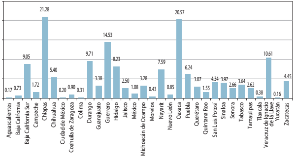 Según los datos calculados para 2020 existe gran variabilidad entre los diversos estados del país. La Gráfica 1 muestra el porcentaje de personas por estado, con bajo o muy bajo grado de accesibilidad a la carretera pavimentada. Los estados con mayor porcentaje de personas con escasa accesibilidad son Chiapas y Oaxaca; y con mayor accesibilidad, Yucatán (0.16%), Aguascalientes (0.17%) y Ciudad de México (0.20%).