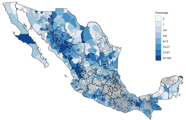 A nivel municipal, en promedio, 15.47 por ciento de la población tiene bajo y muy bajo grado de accesibilidad. El Mapa 1 muestra cómo, más allá de los estados previamente mencionados, existen municipios con alta deficiencia en cuanto al acceso a la carretera, por ejemplo, municipios en Chihuahua, Durango, Sonora, Nayarit, Veracruz y Baja California Sur.