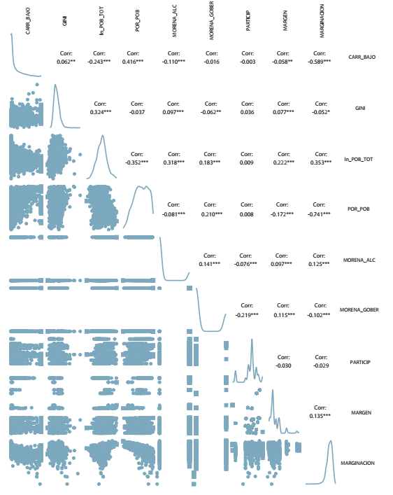 Una vez identificadas las variables independientes y dependiente, y previo a la estimación del modelo estadístico, se realiza un análisis estadístico descriptivo con el fin de identificar las relaciones entre las variables. La Gráfica 2, en la diagonal, muestra la distribución de cada una de las variables. Se observa que tanto el índice de Gini como el porcentaje de población con bajo y muy bajo acceso presentan un sesgo positivo. Es decir, existe una mayor acumulación de casos (municipios) en los valores más bajos. Por otro lado, se observa que la distribución del porcentaje de pobreza y de la población es un poco menos sesgada, mientras que las demás variables son un tanto diferentes. En cuanto a las relaciones entre variables, se observa que la correlación más alta es entre el porcentaje de población en situación de pobreza y el acceso: mientras mayor es el porcentaje en situación de pobreza, mayor el porcentaje con bajo y muy bajo acceso a carretera. Además, entre más personas habiten el municipio, menor el porcentaje de población con bajo acceso.