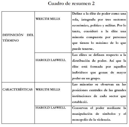Dadas estas visiones ¿cómo puede entenderse a las élites?, ¿dónde se identifican?, es decir, ¿quiénes son las élites políticas? Como parte de la respuesta planteada por diferentes autores se presenta el cuadro de resumen 2.