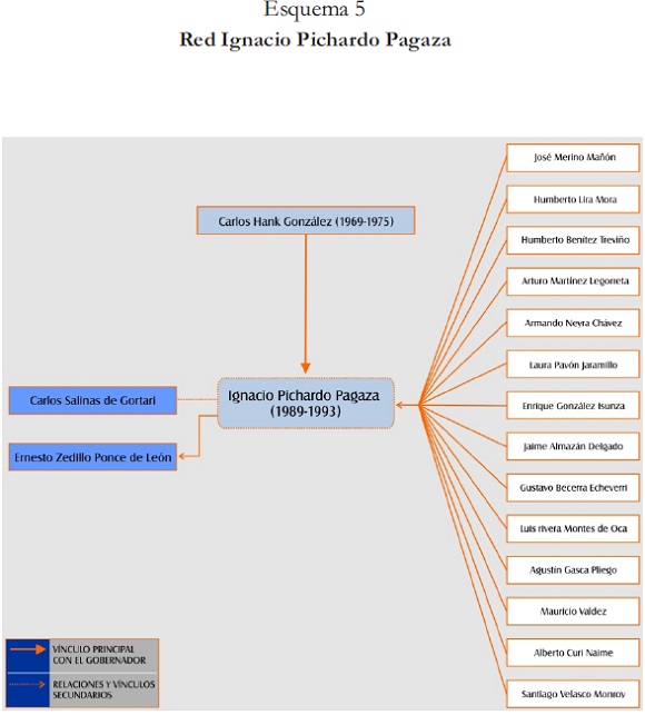 Por lo tanto, el rol central de los actores incluidos en las redes fueron sus posiciones en el PRI, en la burocracia local y nacional, así como sus puestos de elección popular. El tipo de relaciones que se crean en primer término son las que se formaron en sus carreras políticas, después las de tipo familiar y de amistad [véanse casos de los Del Mazo en Esquema 1]. Cabe aclarar que las organizaciones que permitieron las relaciones fueron su participación en el gobierno local y su militancia en el PRI. Así que todas las relaciones que el individuo mantiene (en torno a la sucesión gubernamental y la composición de los gabinetes) se aíslan sólo para el análisis de las mismas.