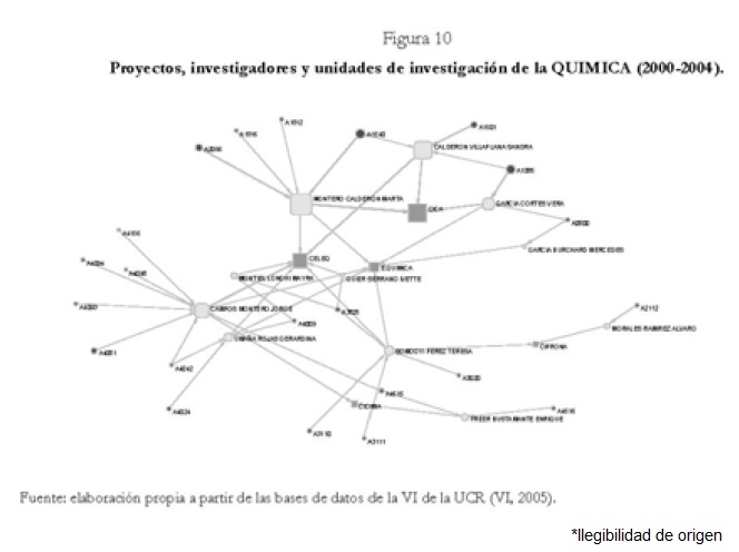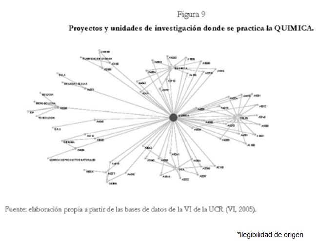 Respecto al análisis de la química, observamos que entre 1977 y 2005 en las IU, en orden de visibilidad, el CELEQ, la E. QUÍMICA, el CICA y el CIPRONA; sin embargo entre 2000-2004, se vuelve visible el CICIMA y CIPRONA. El análisis de los proyectos de los investigadores de mayor visibilidad muestra que el mayor trabajo de la QUÍMICA se lleva a cabo en el CELEQ como se apreció en el análisis de 1977 a 2005.