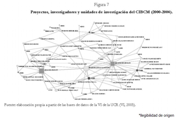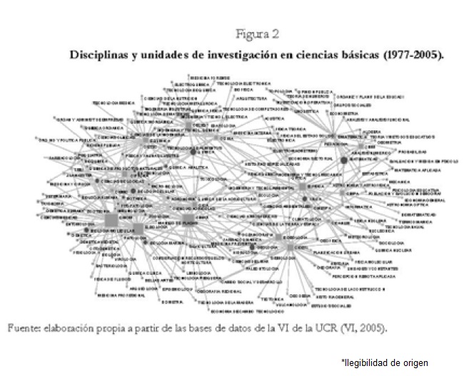 La lectura sociotécnica de los proyectos registrados entre 1977 y 2005 da cuenta de realidades relacionales heterogéneas; así tenemos que existen regiones formadas por relaciones estrechas entre disciplinas e instituciones en las matemáticas y la física, excepto que recientemente se aprecia la preponderancia del CIMPA en las matemáticas; una región formada entre una disciplina y más de una institución como en el caso de la química y un centro de investigación y una escuela; se aprecia una región de gran complejidad de relaciones entre disciplinas como en el caso de la biología celular y moiecular, y la escuela de biología y un centro de investigación que engloba las dos disciplinas mencionadas; y, finalmente, se pueden observar dos centros de investigación (CIMAR y CICA), colocados egocéntricamente entre múltiples disciplinas.