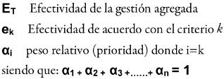 A partir de esta comprensión de la efectividad en la gestión, es posible realizar valoraciones agregadas del conjunto de actividades de la organización con la que estemos tratando; esta perspectiva integral, en sistemas de evaluación complejos, es la que permite establecer procedimientos de alerta temprana que consienten ajustes y/o rectificación de las acciones tendientes a obtener el resultado deseado. En este tenor, y para establecer el grado de cumplimiento de los compromisos de resultados, metas y objetivos, en su conjunto, acudimos a las herramientas que nos ofrece la planeación estratégica en el ámbito de establecimiento de prioridades, asignándose a cada criterio un valor convencional que manifiesta el peso relativo, el cual, finalmente, en su agregación nos hace reconocer el avance y logros de nuestras actividades. Para esto último se propone medir la efectividad de la gestión de acuerdo con la siguiente fórmula:
