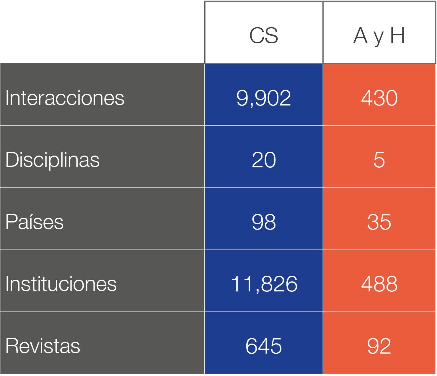 En la Figura 1 1 se muestra la composición del universo de estudio por áreas de conocimiento, se especifica la cantidad de instituciones y países que participaron en las interacciones internacionales, la cantidad de revistas en que se publicaron los artículos científicos resultantes de dichas interacciones, así como la cantidad de disciplinas donde se registró colaboración internacional (en el caso de CS todas las disciplinas del área registran colaboración internacional; en el caso de AyH fueron cinco disciplinas de seis). Cabe mencionar que en el análisis se sigue la clasificación por disciplinas propuesta por Redalyc.org, la cual es definida a partir de la información proporcionada por las propias revistas.