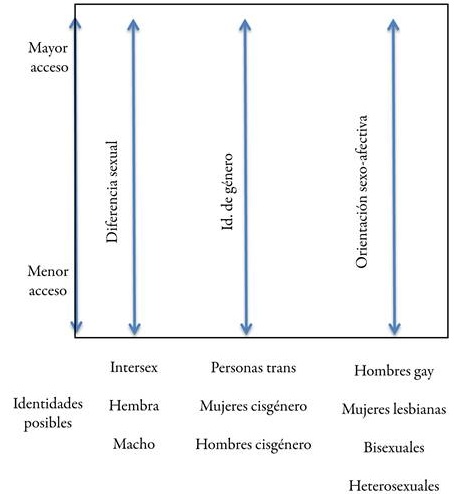 Respecto a la categoría diferencia sexual, la participante plantea que los machos serían la identidad con mayor acceso a derechos/garantías sociales/beneficios; que las mujeres se encontrarían en una posición intermedia, y que quienes tienen menor acceso serían las personas intersex. “Los hombres tienen más beneficios que las mujeres, en lo macro, pero en lo micro siento que el hombre heterosexual tiene aún más beneficios” (Na, comunicación personal, 17 de mayo de 2019).
