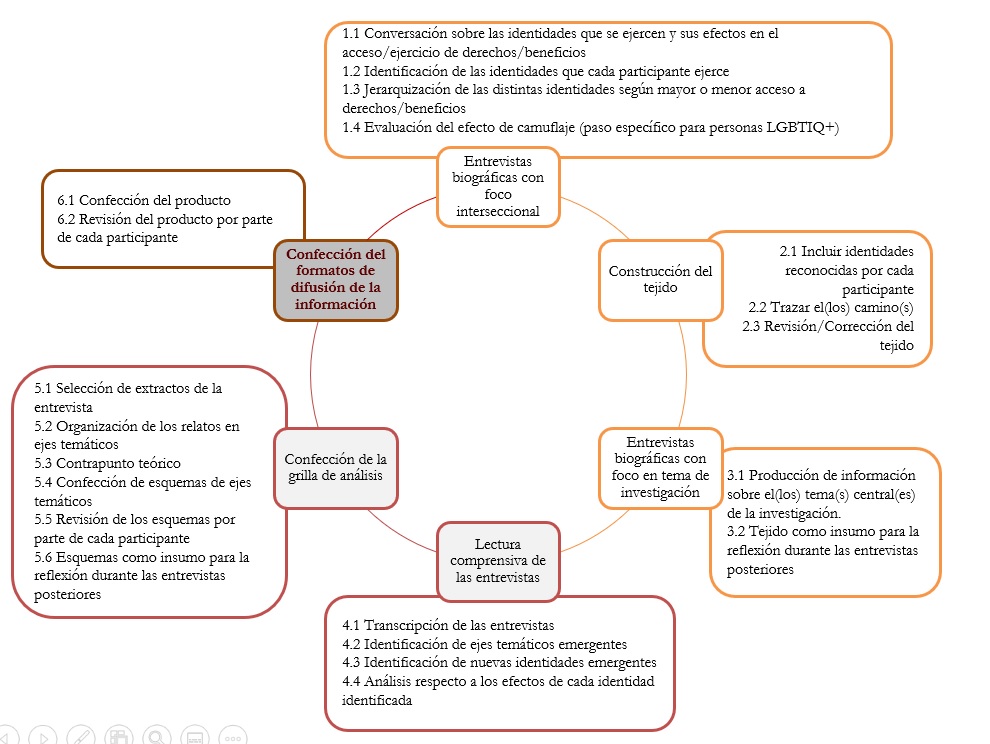 Posterior a esto, se les invita a reflexionar sobre cuáles categorías creen relevantes en cuanto a la temática de la investigación, así como sobre las identidades que constituyen cada una de esas categorías. Después se les solicita que jerarquicen dichas identidades respecto a cómo acceden o cómo se les limita acceder a ciertos derechos/garantías sociales/beneficios. De esta manera, se identifican las diversas categorías/identidades que son relevantes según la experiencia específica de cada participante.
