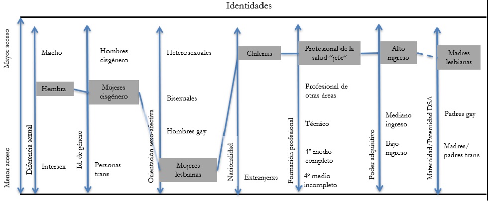 Las personas podemos estar situadas en posiciones diversas que se entrelazan, generando efectos interseccionales también diversos. Por ejemplo, el hecho de ser una mujer lesbiana médica la ubica en posiciones subalternas como mujer y lesbiana (frente a los hombres y a quienes son heterosexuales, respectivamente); asimismo, la sitúa en una posición dominante como profesional de la salud en contraposición a las personas que no son profesionales y a quienes ejercen profesiones menos valoradas socialmente (Alday-Mondaca y Lay-Lisboa, 2021 a) .
