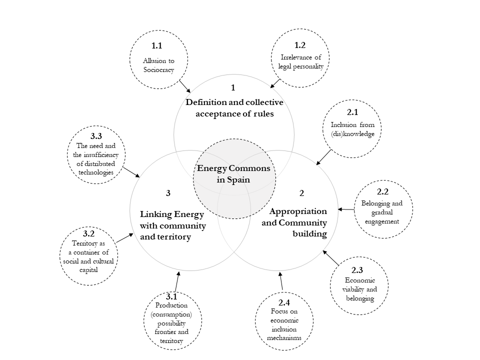 Across their three dimensions —resources and economy, stakeholders and institutions, and discourse— the institutional characteristics that already exist in Spain have facilitated the appearance and consolidation of the Energy Commons (Atutxa et al., 2020; Atutxa and Zubero, 2019). Research has begun into this local phenomena in the field of Energy (Giotitsas et al., 2020; Melville et al., 2017; Giotitsas et al., 2022; Riutort, 2017; Urkidi et al., 2015; Zubialde, 2016) , but there is still much to understand about its dynamics. This is the point where our research is situated. Through an empirical investigation based on 18 in-depth semi-structured interviews, this paper analyses; 1) how Energy Communities define and accept shared norms and the influence that their legal status may have on them; 2) how these communities are formed, the commitments their members make and the mechanisms for economic inclusion that they implement, and; 3) the connections between energy as a social commodity, the community and the territory in which they operate (Figure 1 ) . Fundamentally, it is a scientific contribution to a better understanding of the debate around the energy justice that European Energy Communities aim to achieve (Caramizaru and Uihlein, 2020) . That is, the debate about the potential that the Energy Commons have to bring the desired socio-technical changes in the energy landscape, in a morally, and socially just way.