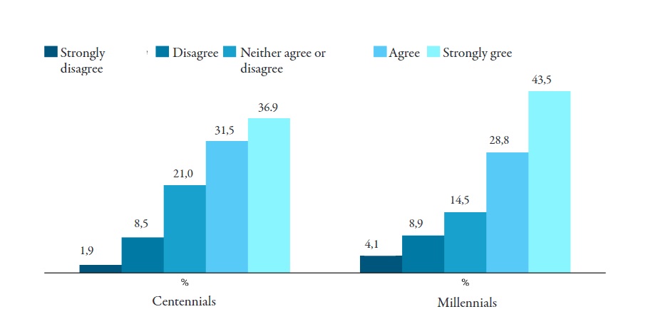 Millennials3 are members of a generation who were born surrounded by mostly digital media but who have also had access to analog technology (Barrientos-Báez et al., 2022: 286) and whose identity is built on "cultural shifts resulting from the social changes, economic and political events that have occurred in the formative years of this generational development" (Ross and Rouse, 2022) . For example, some characteristics of millennials are ethnic diversity, having lived through the rapid pace of globalization, technological proliferation, and economic recession. In addition, they are interested in "values of tolerance and social justice" (Ross and Rouse, 2022). Secondly, centennials, according to another analysis by the Pew Research Center (Parker et al., 2019) , while sharing many of the same values as millennials, differ from millennials in two ways: First, members of Generation Z are more likely to say "they know someone who prefers that others use gender-neutral pronouns for them" (They) and, second, they are more likely to prefer that online forms or profiles that ask about gender "should include options other than male or female" (Parker et al., 2019).