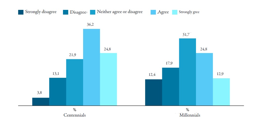 As a general rule, millennials and centennials in Spain and Mexico, with very little difference, agree that the changes that could occur in films or series, in terms of modifying plots or storylines, are more linked to a clientelist vision of the studios than to the empowerment of the audience. They perceive that the social or historical change that may exist (for example, the treatment of a minority) is due more to a business vision and the effect of audiovisual marketing than to a social or cultural conquest on the part of the audience. Despite the minimal differences, millennials agree more than centennials in this statement, which reflects a high level of political alienation in both generations (Figure 1).