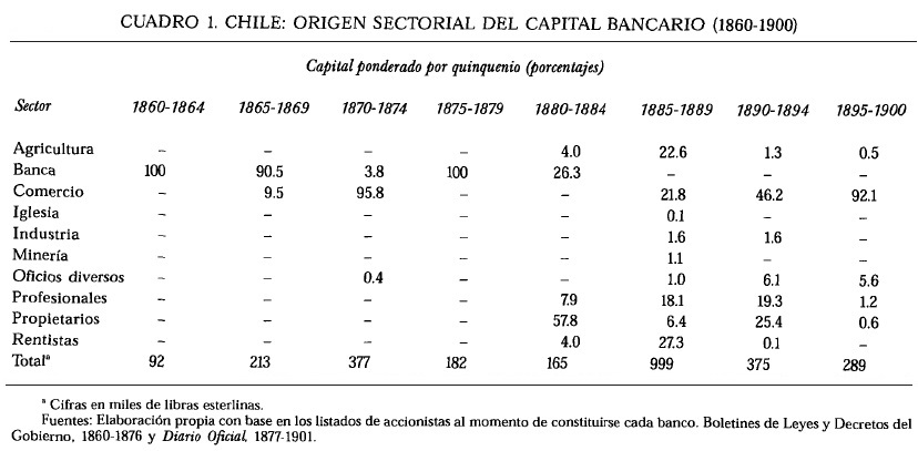 A partir de la información señalada se ha podido constatar que entre 1860 y 1879, aproximadamente, el aporte de capital para formar bancos provino del mismo sector bancario-financiero (el caso típico fue el de Agustín Edwards), o desde el comercio. Sólo a partir del ciclo salitrero los agentes económicos de los otros sectores -productivos o no- entraron al atractivo negocio de los bancos.