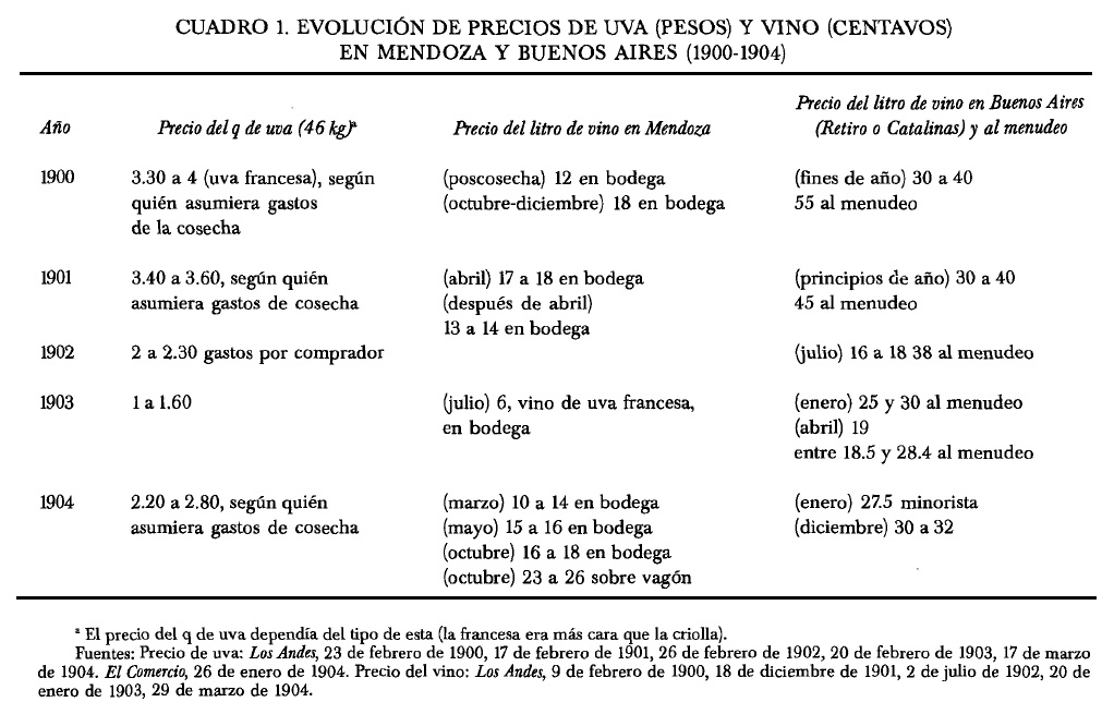 La segunda columna del cuadro 1 contiene el precio del quintal de uva durante la cosecha (entre los meses de febrero y mayo de cada año). Los precios cambiaban de acuerdo con quién pagaba los gastos de la recolección (el viñatero o el comprador de la uva); por ejemplo, en 1900, el quintal de uva francesa (de mejor calidad) costaba 3.30 pesos si el comprador asumía los gastos y cuatro pesos si lo hacía el viñatero. La tercera columna presenta dos cotizaciones del precio del vino en la provincia: "en bodega", que era el de las transacciones entre los elaboradores locales y sin el pago del impuesto provincial, y el precio "en vagón", es decir, cuando el vino estaba en condiciones de ser enviado hacia los centros de comercialización, que sí incluía el cumplimiento fiscal, aunque no el pago del flete. Finalmente, la última columna ofrece información sobre el precio del vino pagado por el consumidor.
