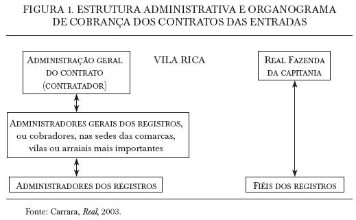 Para a cobrança do imposto das entradas aos comerciantes proprietários das mercadorias transportadas organizouse um amplo aparato administrativo. Para tal, os contratadores contavam em cada cabeça de comarca, vila ou arraial mais importante de um "continente" (região) da capitania com administradores gerais ou cobradores. Em cada registro havia um administrador, pago pelo contrato, e um fiel, ou fiscal, pago pela Real Fazenda (figura 1).