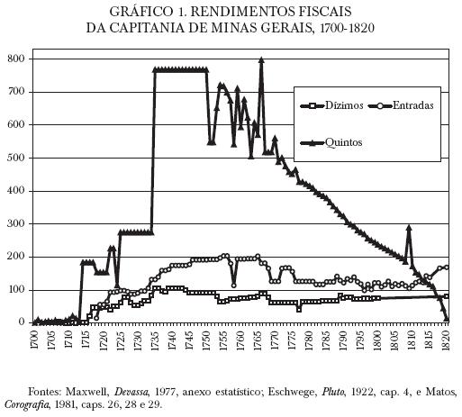 Só para se ter uma idéia, no triênio de 1762 a 1764 os dízimos renderam aos cofres da Provedoria da Real Fazenda de Minas 229:530$000, enquanto que as entradas atingiram a cifra de 587:040$000 réis, quase três vezes mais. A soma do valor arrecadado com estes dois tributos era suficiente para comprar 1 952.15 kg de ouro em barra. Os quintos renderam no mesmo período 2 950.13 kg de ouro.
