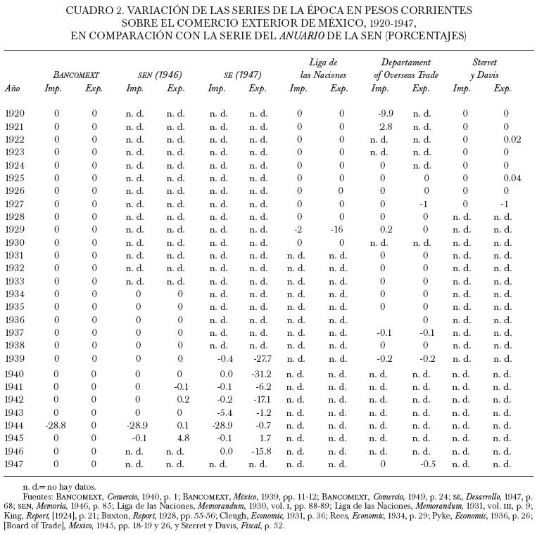 La única serie completa para la etapa en su conjunto fue publicada por el INEGI en sus Estadísticas históricas. Dicha serie, que se supone está presentada en dólares oro estadunidenses de 1932, en realidad remite a cifras en dólares corrientes, pues, de haber sido hecha con base en dólares oro de 1932, debería coincidir en su totalidad con la serie en dólares oro que difundió la Liga de Naciones para 19261936 y con la del Anuario de la SEN para 19321939. Por otro lado, la serie del INEGI tampoco concuerda con la serie en pesos de esta última publicación, lo cual podría desprenderse del hecho de que el INEGI trabajó con las cifras ofrecidas por la SHCP y por las del BANXICO. Empero, la confrontación de la información publicada por el grupo de trabajo del BANXICO para 19301947 con la del INEGI, obliga a descartar esta posibilidad en lo concerniente a los datos de importación, pues las cifras del Instituto difieren de las del BANXICO. En contraste, la serie de exportación del INEGI para 19391947 es idéntica a la que publicó el BANXICO para el total de exportaciones de mercancías y servicios. Así, puesto que el INEGI no precisa detalles acerca de las cifras que reprodujo, el investigador debe darse a la tarea de identificarlos.
