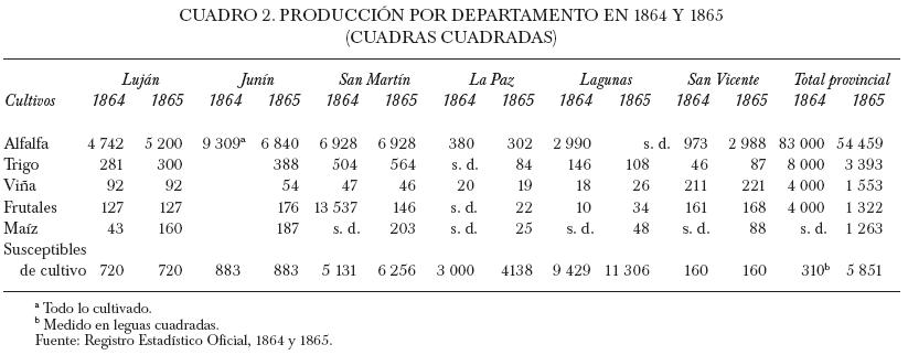 Los registros estadísticos de 1864 y 1865 permiten evaluar las características productivas de la economía provincial. El predominio de la alfalfa es acompañado por la producción triguera con una escasa representación de viñas, frutales y otros cultivos; la superficie cultivada es extremadamente reducida si se la compara con la disponibilidad de tierras posibles de ser incorporadas a la producción y de amplias extensiones ocupadas por "bosques" de flora local y serranías; no estaría de más insistir en el carácter intensivo de la agricultura local y de su dependencia absoluta del acceso al riego artificial sea bajo canalización, aguadas emergentes o baldes pozos (véase cuadro 2).
