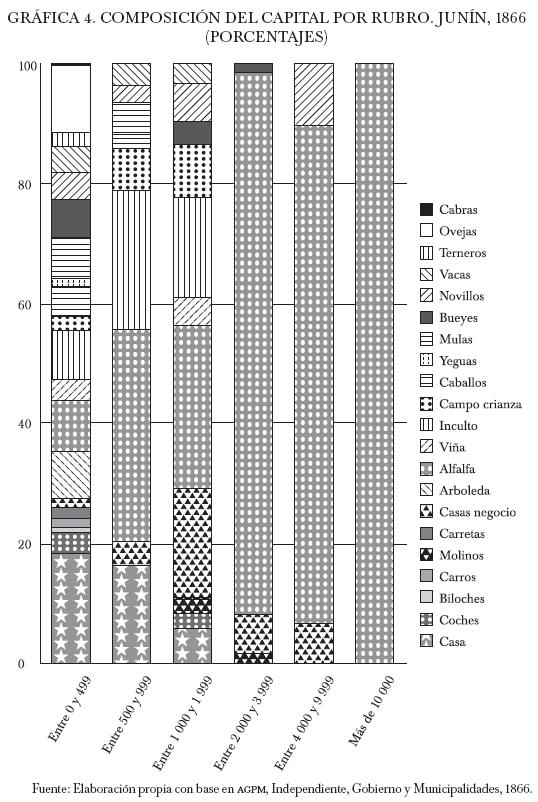 Esta rápida mirada adquiere mayor precisión si se analiza la composición de capitales por rubro en las categorías de propietarios ya utilizadas. Abordemos entonces la composición personal de la riqueza para lo cual conviene detenerse en la gráfica 3 que no introduce mayores sorpresas respecto a la representación de la alfalfa en todas las categorías, aunque su posición varía significativamente en cada una de ellas. Mientras predomina en las porciones de capitalistas comprendidos entre 2 000 y más de 10 000, supera 50% de los capitales reunidos por aquellos incluidos entre 1 000 y 1 999 para luego decrecer entre los más pobres. De manera sobresaliente esa tendencia acompaña la representación del ganado que alcanza proporciones equiparables entre los menos favorecidos disminuyendo su peso entre los más ricos o concentrados. Se trataría en todo caso de que entre los menos favorecidos el rubro ganado opera como capital "fijo" dedicado fundamentalmente a la cría y al sistema de transporte como lo ilustra el caso de Junín, mientras que en los más ricos parece funcionar como "giro comercial". Asimismo, los más concentrados se distinguen del resto al complementar la inversión en alfalfa destinada a la invernada con la producción sobre todo de harinas (y menos de trigo) al disponer la mayor representación de capitales en molinos, aunque no en tiendas o almacenes, que parecen predominar entre los reunidos en las categorías intermedias. Los más ricos tampoco parecen estar inclinados a invertir en el rubro "casas", aspecto que contrasta con el resto de las categorías en las cuales adquiere mayor peso entre los menos favorecidos para decrecer en las categorías más prósperas, con lo cual se avizora un fenómeno relativamente frecuente de las pautas habitacionales urbanas de estos grupos sociales. En cambio, la representación de viñas (y/o frutales) si bien aparece en todas las categorías, predomina entre los más pobres y casi desaparece entre los ricos: no se trata de un asunto menor porque a pesar de las diferencias en los avalúos, la cuadra de viña podía duplicar y hasta triplicar el valor de la cuadra de alfalfa en los departamentos más prósperos. Por ejemplo, el precio promedio por cuadra de alfalfa en La Paz era de 20 pesos, en Rosario de 26.67 pesos, en San Martín de 26.95, la de Luján casi triplicaba este último valor ascendiendo a 69.28; en Junín la cuadra de alfalfa era más cotizada aún: 75 pesos. En cambio, el valor promedio de la cuadra de viña era muy superior, y también variaba por departamentos.25 Esta imagen general se modifica al ensayar una aproximación micro a la distribución de capital por rubro en los departamentos. Como se adelantó, Junín era una localidad del este provincial con autonomía administrativa desde 1858 y constituía un punto de intermediación mercantil con el Litoral. El negocio de la alfalfa constituía la principal actividad, y las casas de comercio cumplían un papel predominante en la intermediación entre los productores y los centros de consumo, "siendo los propios habitantes agentes pagados por los compradores para transportar los productos en arreas, carretas y castillos". Los comerciantes eran también quienes habilitaban a los labradores al principio de las sementeras y se pagaban con el producto de la cosecha.26 La gráfica 4 arroja indicadores sustanciosos para aproximarnos a la naturaleza y composición de aquella economía agraria. Como se aprecia, los capitales de los más ricos están destinados de manera exclusiva a la alfalfa, siendo los propietarios de las categorías cuatro y cinco intermediarios entre los pequeños propietarios de ganado (y trigo) al concentrar el rubro molinos (que alcanza incluso a la categoría inferior) para la elaboración de harinas. En consecuencia, las categorías más pobres son las más diversificadas: la participación de alfalfa el negocio más rentable que alcanzaba 91% de la tierra cultivada y la representación de ganado, cereales, viñas o parrales, carros y pulperías permite apreciar la fisonomía de los patrimonios más pobres. En torno a ellos, se distingue la extrema fragmentación de la categoría uno frente a la dos y a la tres. En ellas se destaca la abrumadora presencia del ganado, de los cereales y de las viñas o parrales. Resulta ilustrativo precisar las características de esta "riqueza ganadera": los capitales depositados en el rubro ganado alcanzan un total de 59 916 pesos distribuido en orden decreciente por vacunos (terneros, novillos y vacas: 38.22%), caballos (11.72%), mulares (13.68%), bueyes (16.90%), ovinos (18.97%) y cabras (0.48%).