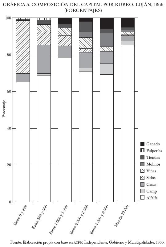 Si analizamos la composición de capitales por rubro de Luján, los más ricos superan 80% del capital en alfalfa siguiéndolo en orden de importancia una mínima representación del ganado (10%). Pocas dudas caben de que estos datos podrían estar omitiendo un rasgo distintivo de la dinámica ganadera comercial en cuanto exigía distribuciones territoriales estratégicas para el engorde de ganado previo a su paso a Chile. No obstante, esa limitación no descalifica per se el argumento en la medida en que ratifica el dominio casi exclusivo de la alfalfa destinada al engorde del ganado no sólo para su venta en pie a Chile (por lo que debía recuperar peso para el cruce cordillerano que incluía necesariamente las pasturas en los alfalfares de la cordillera), sino porque alimentaba el sistema de transportes. Estas evidencias adquieren mayor visibilidad frente a un dato que se prefigura en la gráfica 5: la labranza de alfalfa ocupa la casi totalidad de tierras cultivadas. El cultivo de alfalfa entre los más pobres es también predominante y ocupa prácticamente la totalidad de las cuadras disponibles de sus propiedades. Esa característica se distingue en el caso de Junín antes señalado donde las categorías uno, dos y tres tienen participación relativa en la crianza de ganado, actividad sin mayores requerimientos de capital en función de que era realizado en campos abiertos y sin vinculación con la exportación. Por otra parte, el análisis de la representación del capital en viñas indica el carácter marginal en relación con los totales y la participación diferenciada entre las categorías: en Junín alcanza menos de 10% en la categoría más pobre para crecer en la tres y estar ausente en las más ricas; en San Martín predomina en los más pobres; en Luján la relación es distinta en la medida en que su representación prevalece en las cuatro categorías que distan entre los más pobres y los más ricos. El rubro "casas" constituye otro indicador de interés en esta desagregación de la riqueza por categorías: la primera impresión que surge sobre las localidades de Junín y San Martín es que predomina una tendencia semejante a la que mostró el rubro viñas: la proporción disminuye en relación con los que más tienen; situación que es menos visible para el caso de los propietarios de Luján entre quienes adquiría una proporción mínima que ilumina aspectos no despreciables en relación con el carácter de sus inversiones rurales y sus pautas habitacionales (y comerciales) preferentemente urbanas como antes se ha señalado. Esta clave de lectura sobre los más concentrados parece prevalecer también en el rubro tiendaalmacén, el cual revela que los ubicados en la cima no depositaban allí expectativas importantes; serían otros actores locales (algunos de ellos no menos prósperos) quienes arbitrarían el negocio de la intermediación comercial en las áreas de influencia, recayendo el rubro "pulperías" en los poco y medianamente favorecidos.