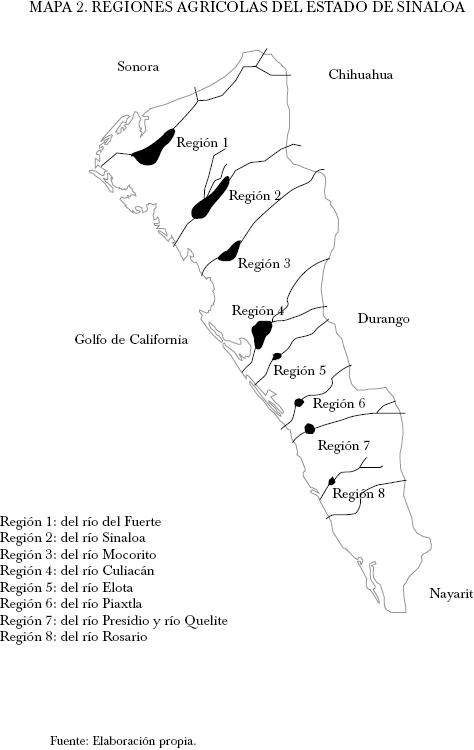 La LFAAES fue analizada y acordada con reformas mínimas el 19 de noviembre de 1932 por el poder legislativo local, bajo el esquema de obvia resolución. La estructura normativa de la ley integraba aspectos como el interés social de las asociaciones y la división del estado en ocho regiones agrícolas, a las cuales el gobierno otorgaría un subsidio igual al valor del impuesto agrícola pagado por los productores asociados (véase mapa 2). Además, las asociaciones asumían la responsabilidad de organizar y reglamentar por producto y región las áreas de cultivo, de la definición de los rangos de calidad de los productos y de los criterios y vías de comercialización. Dichas disposiciones serían instrumentadas, única y exclusivamente, por la Confederación de Asociaciones de Agricultores del Estado de Si-naloa (CAADES), órgano en el cual se aglutinarían las asociaciones creadas.