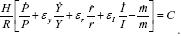 En donde R son las reservas internacionales del banco central; P, el nivel de los precios; Y, el nivel del producto nacional; r, la tasa de interés; I, la inflación; m, el multiplicador monetario, resultante de dividir oferta monetaria entre el monto de M1 (base monetaria más depósitos a la vista), y H, la base monetaria. Por su parte, ey, er y eI son las elasticidades de la demanda de dinero respecto al producto, a la tasa de interés y la inflación; y
