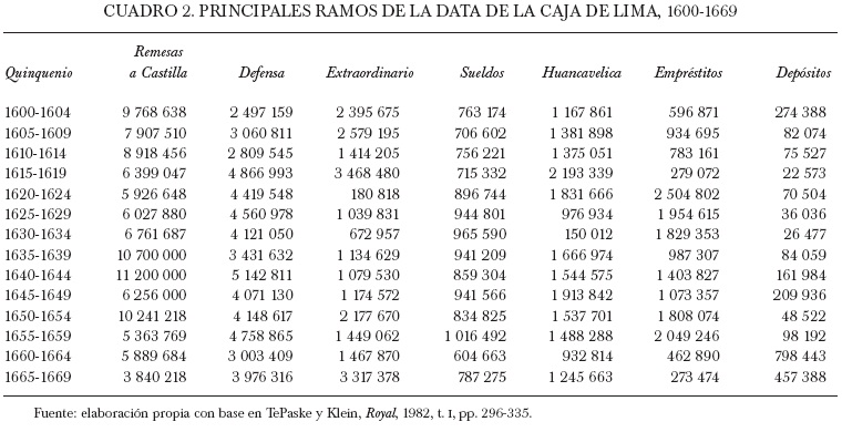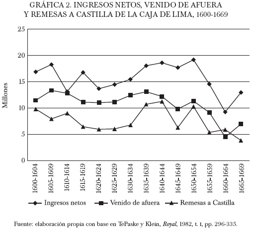 Desde comienzos del siglo XVII hasta finales de la década de 1630, en Lima se habían recibido importantes sumas procedentes de las Cajas subordinadas que ascienden a casi 14 000 000 de pesos de ocho reales en el quinquenio 1635-1639. En cambio, durante las décadas de 1640 y 1650 se produjo un descenso que sólo se revirtió temporalmente en el quinquenio 1650-1654. A partir de este año, se produjo una caída muy pronunciada que se extendió a lo largo de una década. Esta circunstancia reflejó la retracción de los envíos procedentes de Potosí, Oruro y Cailloma, que no fueron compensados con el incremento de las remesas de otras Cajas como La Paz o San Antonio. La contracción del rubro "venido de afuera" tenía profundas consecuencias no sólo por su aporte porcentual a los ingresos de la Caja de Lima, sino también porque componía la parte principal de las remesas a Castilla (véase gráfica 2). De hecho, las partidas de los principales distritos mineros debían enviarse directamente a España, no pudiéndose aplicar para gastos locales. Sin embargo, como recuerda el contador Caravantes, se trató de una disposición que difícilmente pudo cumplirse durante los años que nos ocupan.