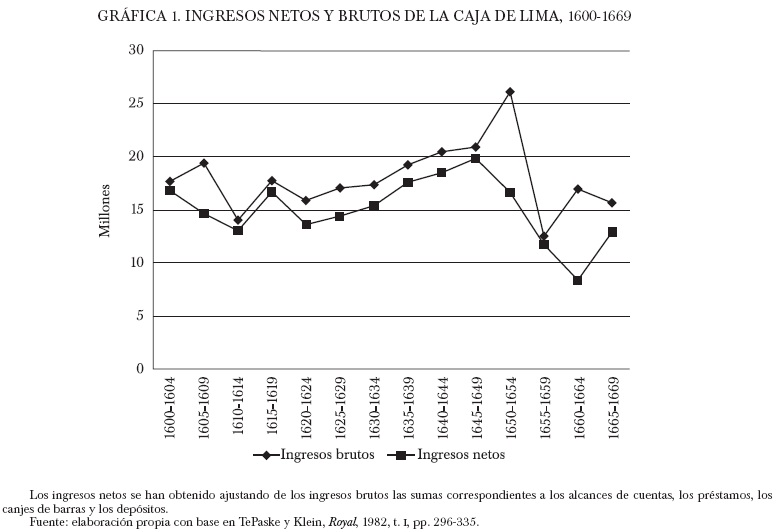 Desde finales de la década de 1630, los ingresos netos totales por quinquenios no sólo no se contrajeron al ritmo del descenso del ramo "venido de afuera", sino que incluso se incrementaron levemente. La razón está en el aumento de un conjunto de rubros fiscales, muchos de los cuales reflejaron claramente el carácter de la fiscalidad del periodo del conde-duque de Olivares, concretamente las nuevas imposiciones y los recursos contributivos que se establecieron en su mayoría durante el virreinato del conde de Chinchón, pero que alcanzaron toda su incidencia en el de su sucesor, el marqués de Mancera, y conservaron cierta vigencia. Como consecuencia, a diferencia de lo que había ocurrido antes y como sucedería después, entre 1639 y 1655, los ingresos netos totales de la Caja de Lima dejaron de tener una dependencia tan estrecha del ramo "venido de afuera" (véase gráfica 2).